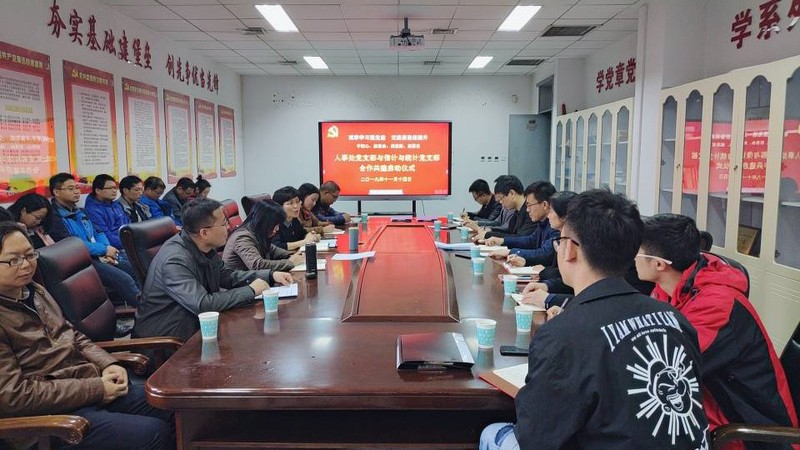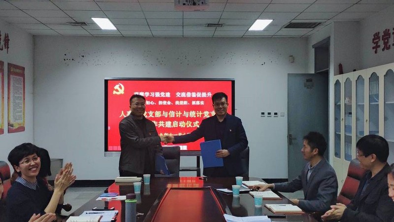 仪式进行过程中,信计与统计党支部和人事处党支部达成了一系列共建项目,签订了合作共建协议,双方握手表示祝贺。