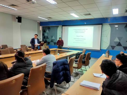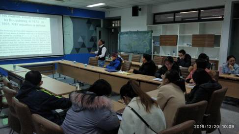 12月20日上午,李继彬教授清晰地讲解了一个旋转双组分Camassa-Holm系统的精确峰、周期峰和伪峰解的问题,给出了约束参数条件,在报告中李教授严谨治学的态度给广大师生留下来深刻地印象;韩茂安教授针对研究生论文写作的问题,系统地叙述了论文写作的基本原则,介绍有关论文写作与课题研究的点滴体会。下午王明新教授首先对我院部分青年教师的国家自然科学基标书做了一对一地的详细指导,并结合一些共性问题提出了好的解决方案,最后做了一个具有自由边界的病毒传播模型的报告,阐述了病毒成功传播的关键因素。