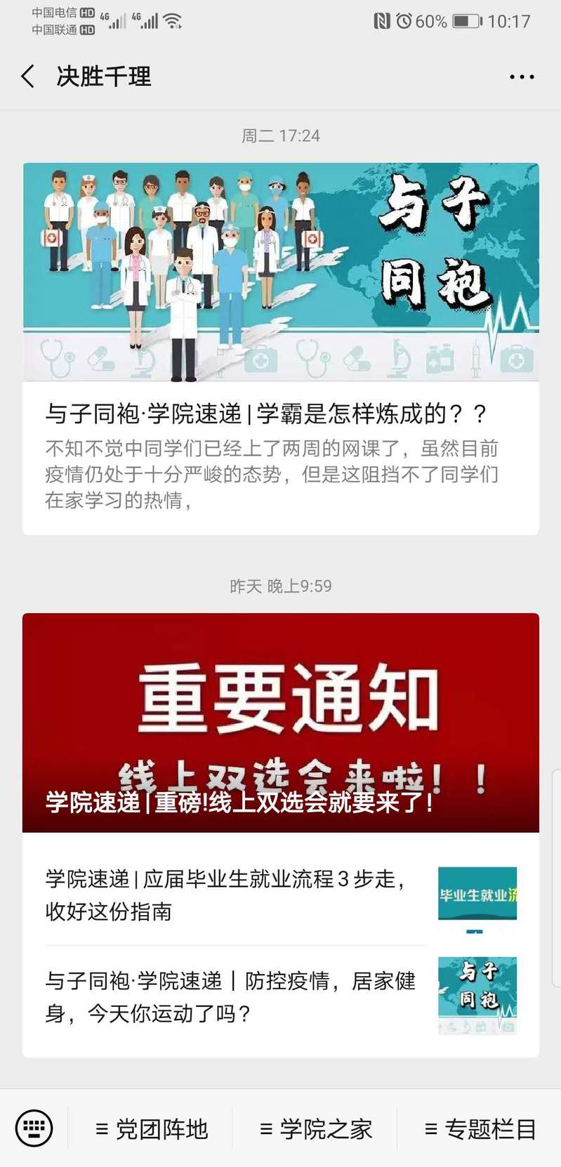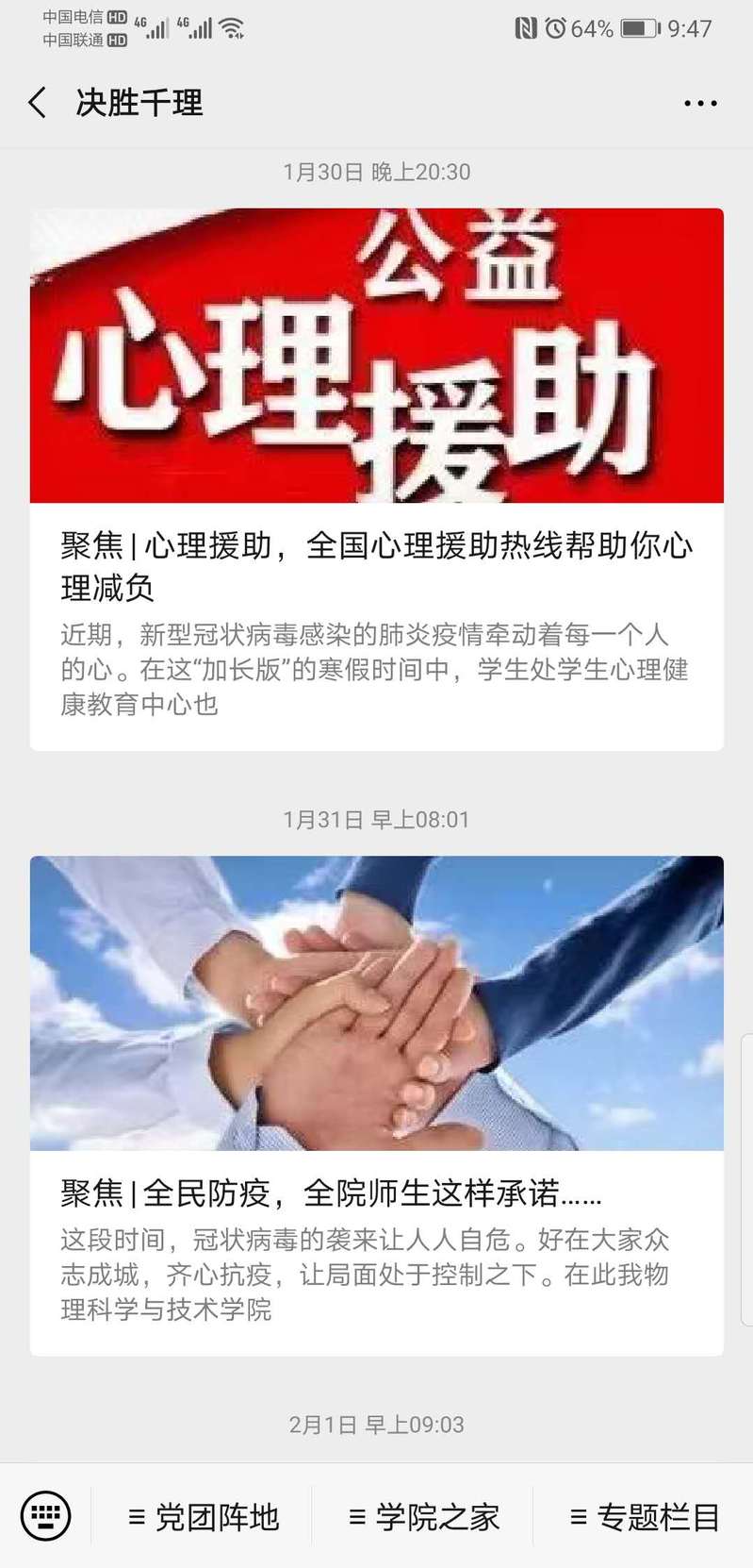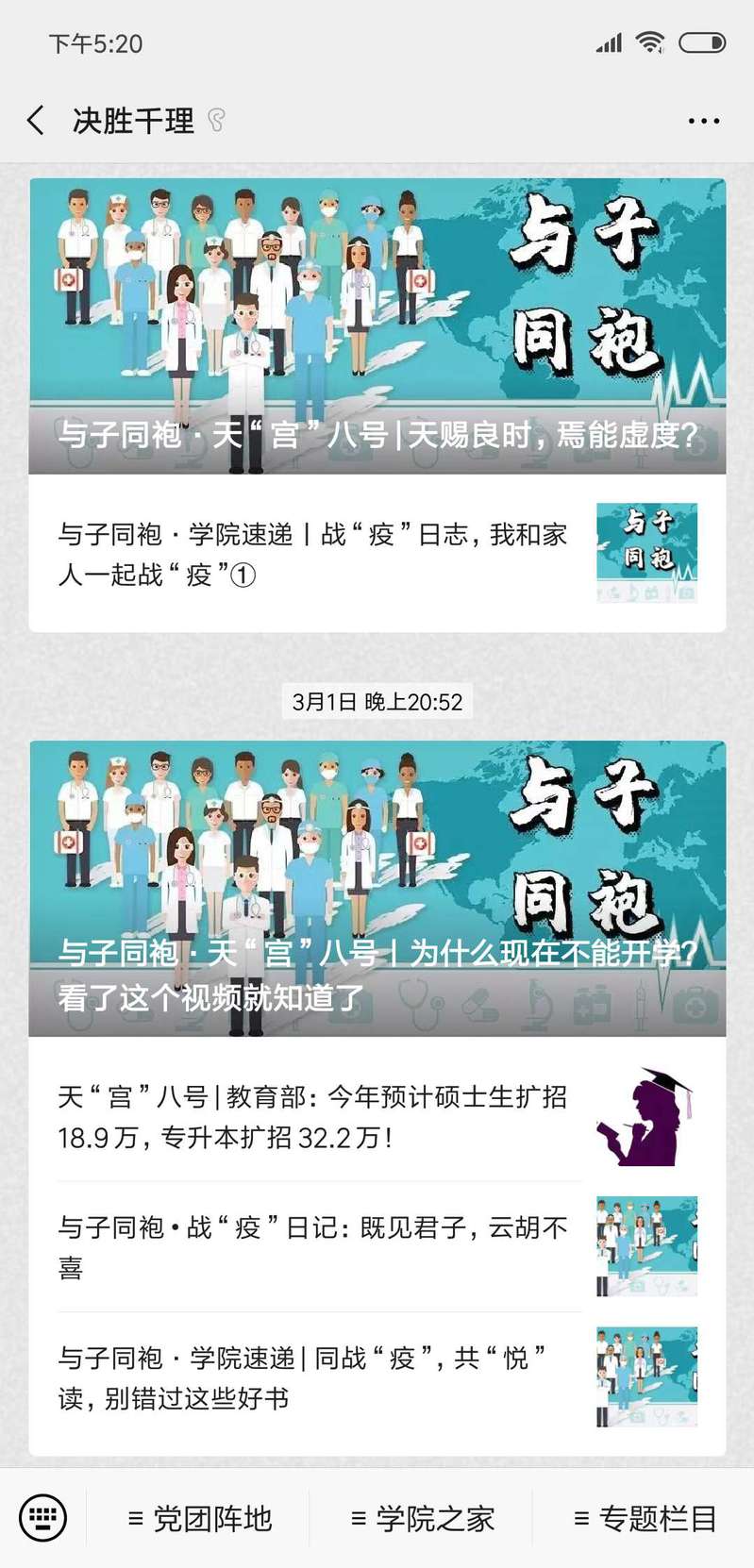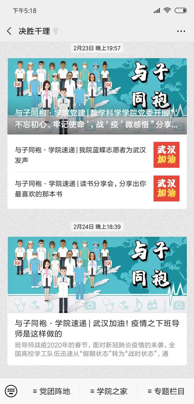 鉴于防疫工作往往难以面对面,学院党委充分发挥网络媒体作用,积极开展线上抗疫防疫工作。依托学院微信公众号“决胜千理”推出抗“疫”系列推文,做好学生思想引领,引导学生科学防控,不造谣、不信谣、不传谣,号召学生听党话、跟党走,同心抗疫。