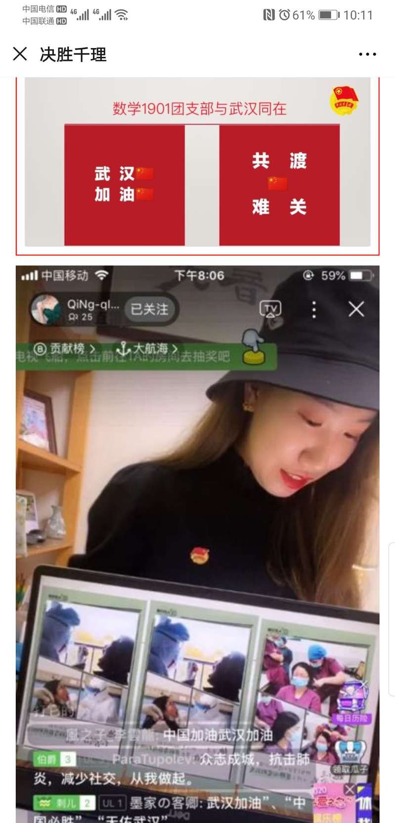 学院党委组织开展了一系列抗击疫情线上主题教育活动,如全院师生防控战疫“接力承诺”活动,党支部“不忘初心、牢记使命”战“疫”微感悟分享等活动,做好疫情防控期间的思想引导工作。党有号召,团有行动,各级团支部积极组织开展共克时艰,青春战“疫”微团课,学生组织、志愿者组织和班级也用不同的形式,为武汉加油,为中国加油!