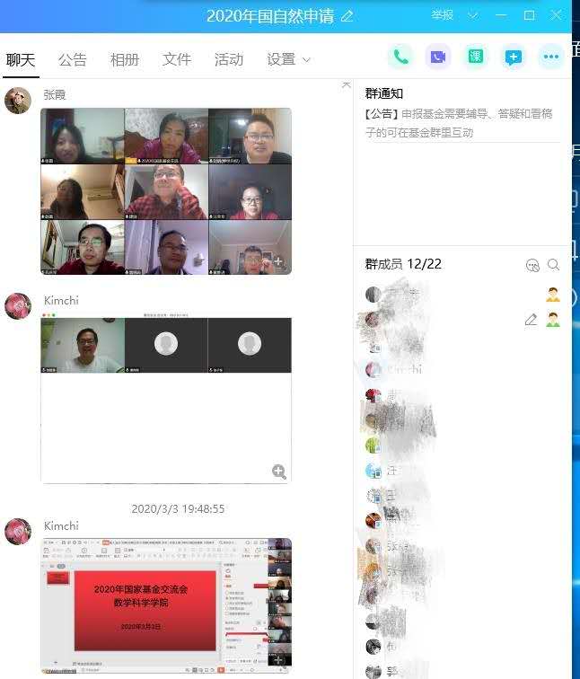 积极引导从事科研工作的教师和研究生居家开展科研活动和课题指导,鼓励开展线上学术研讨和交流。截止目前,数学科学学院利用QQ分屏、网络直播、微信平台等多种方式开展国家基金申报答疑、交流和指导活动活动;建立“新型冠状病毒研究群”,组织学生和教师搜集、分析疫情数据,开展科研活动,利用腾讯会议开展学术研讨。鼓励教师围绕疫情防控开展应用数学的研究和项目申报工作,为疫情防控做好科技支撑。为保障在疫情防控期间做好科研管理和服务工作,学院与上级各部门保持密切联系,时刻关注工作动态、及时传达和组织,制定了《数学科学学院延期开学期间研究生教育工作方案》并起草《硕士研究生招生复试预案》,及时发布和组织各类基金、项目、科技奖励、研究生复试和“十四五”规划平台申报等工作,每天接待大量的招生咨询电话。
