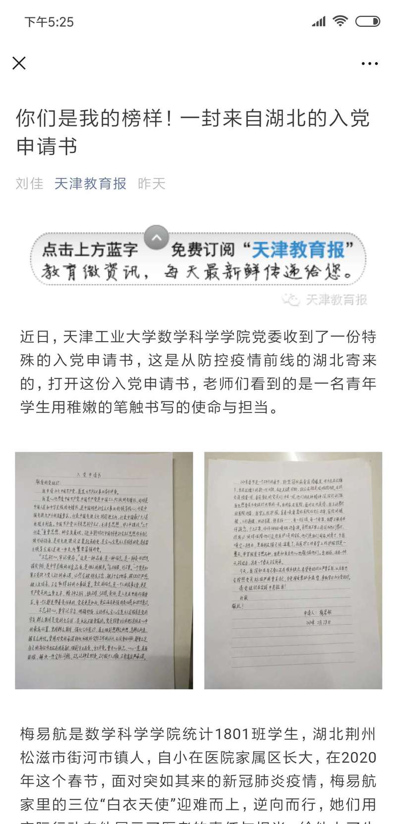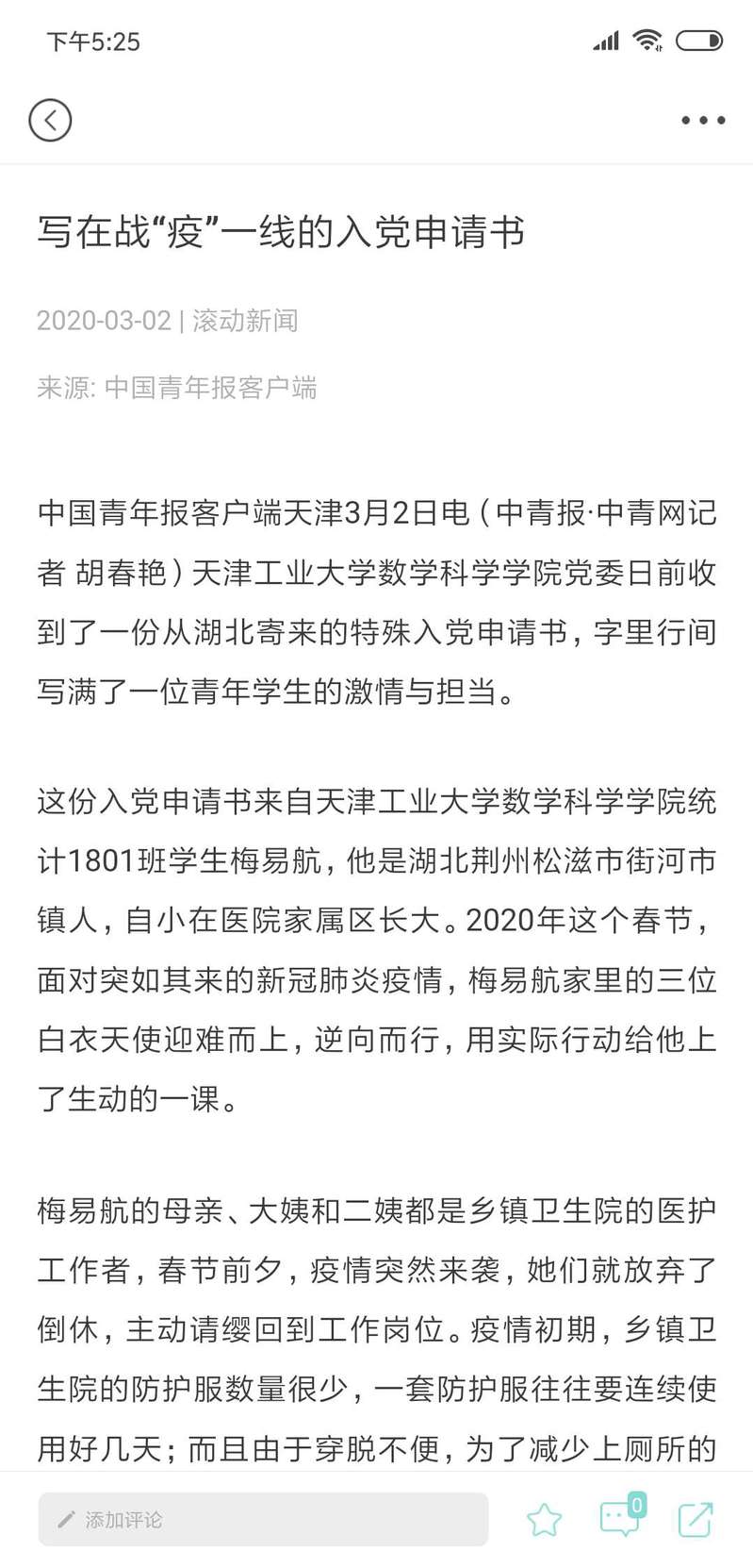 防控疫情期间,学院全体师生众志成城,万众一心,涌现了一批又一批的先进模范,综合管理办公室主任余欣老师作为湖北临时党支部书记,冲锋在前,逆风飞扬,学生党员张萌、杨克帅、杨寒梅、张豪冰等同志积极参与当地疫情防治宣传工作。在党员师生的影响下,入党积极分子银紫君、陈永山、杨振轩同学也投身于社区的疫情防控工作中,梅易航同学在目睹家里三位白衣天使迎难而上的大无畏行动后,毅然穿上厚重的防护服,背上沉重的工具箱,负责起了医院家属区的消毒工作,并向党组织递交了入党申请书。
